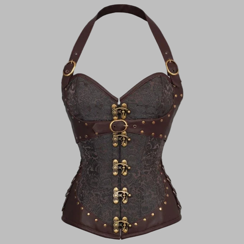 Barna steampunk fűző csillogó mintával és fém csatokkal, női