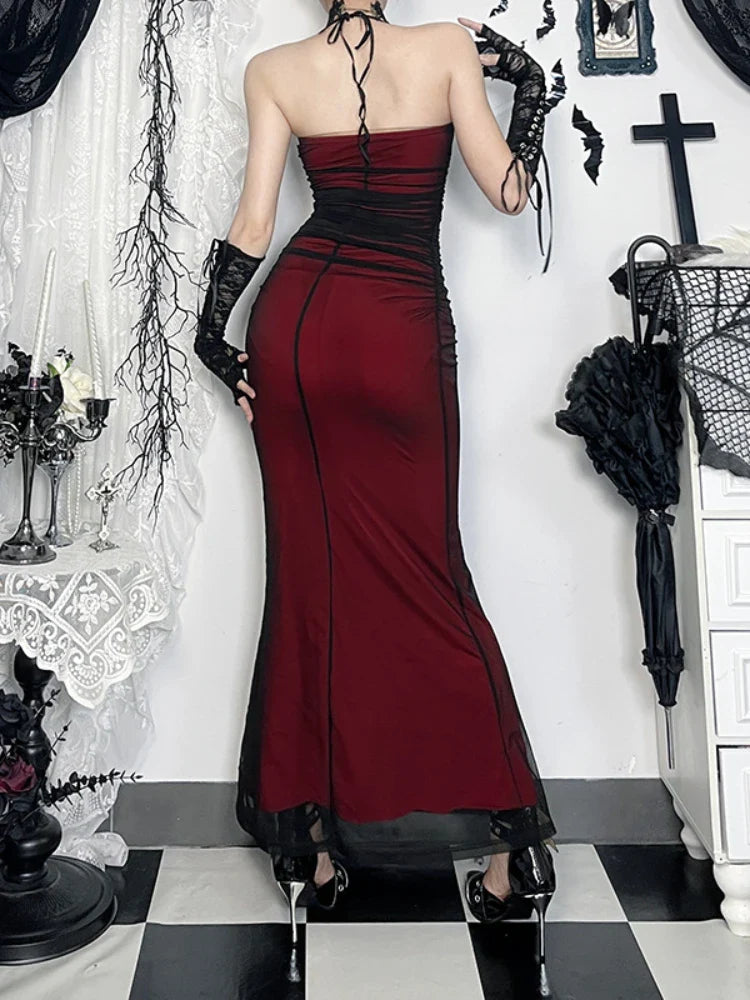 Bordó Hosszú Gótikus Sellő Ruha Hasítékkal és Csipkével