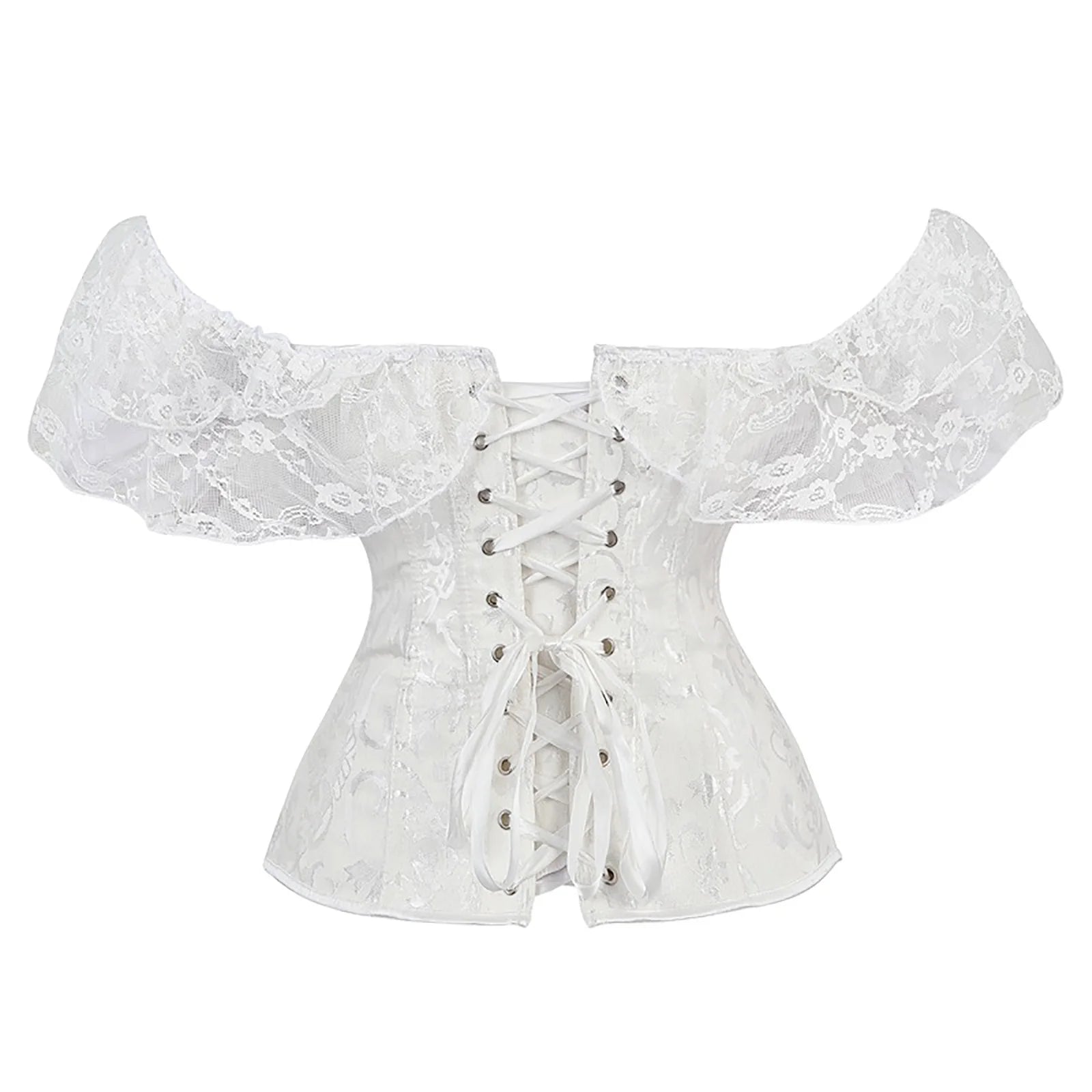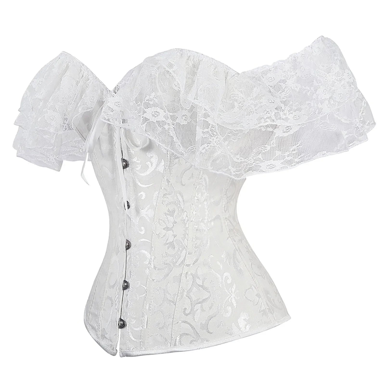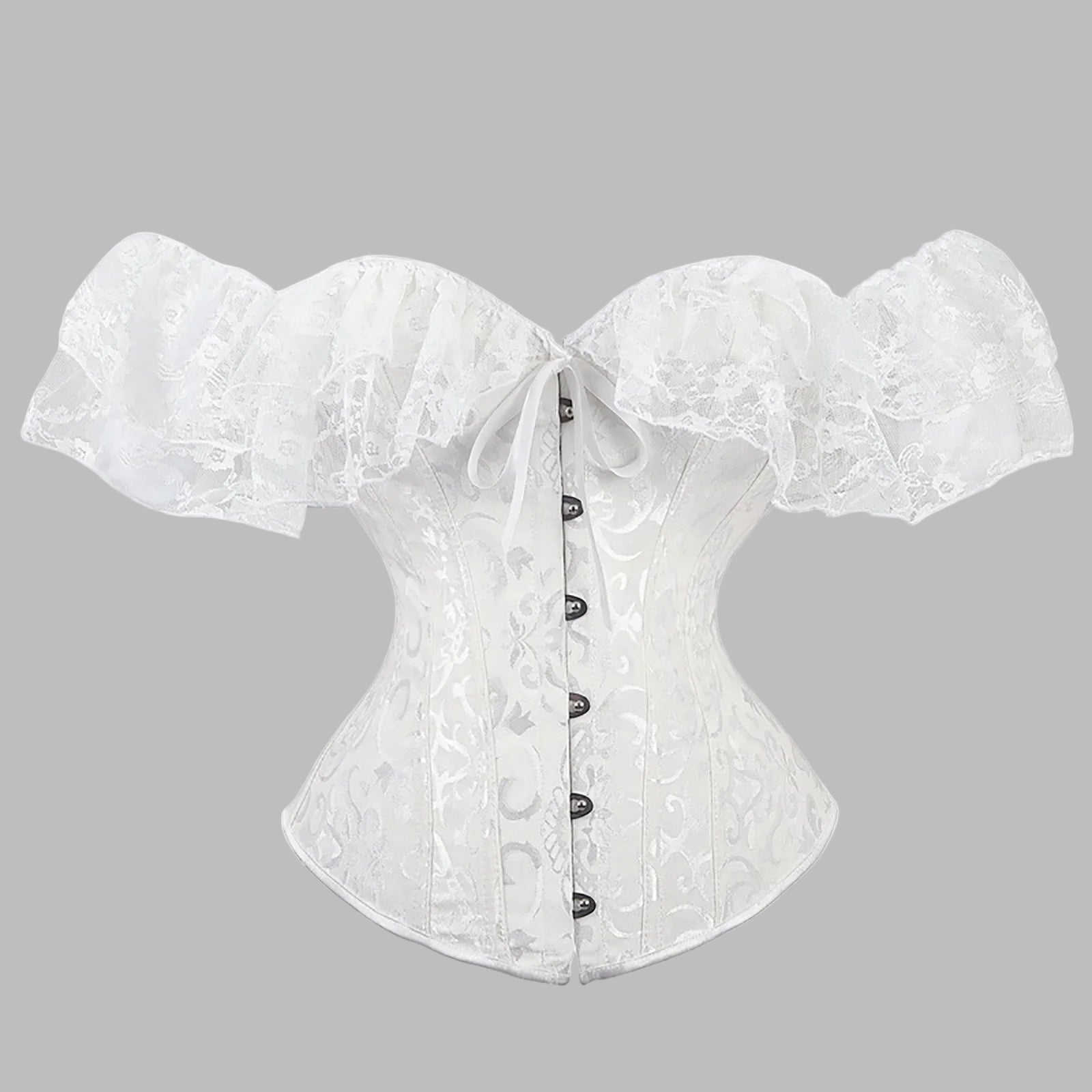 Fehér csipkés steampunk fűző puffos ujjakkal és fém kapcsokkal