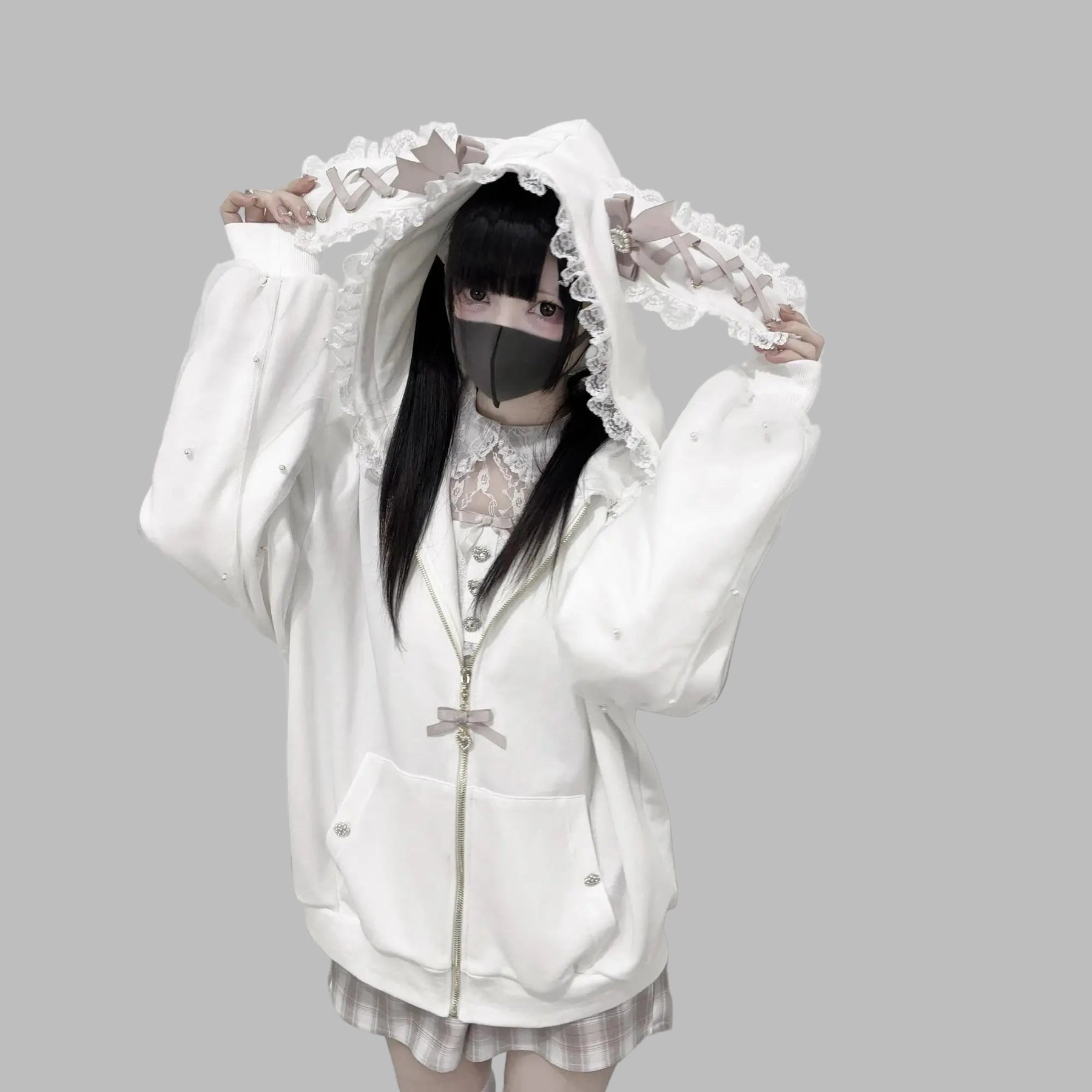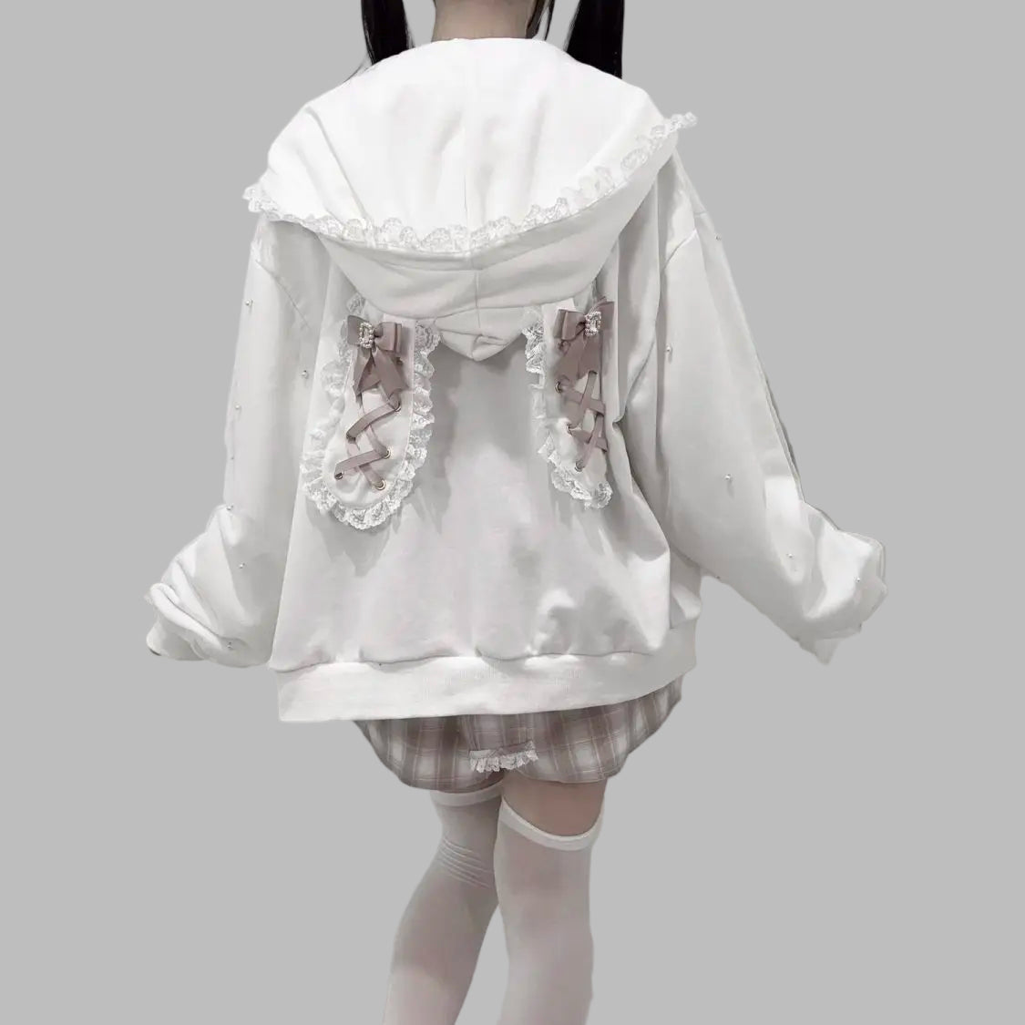 Fehér Jirai Kei oversize pulóver csipkés masnikkal