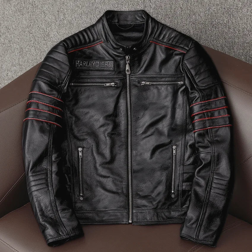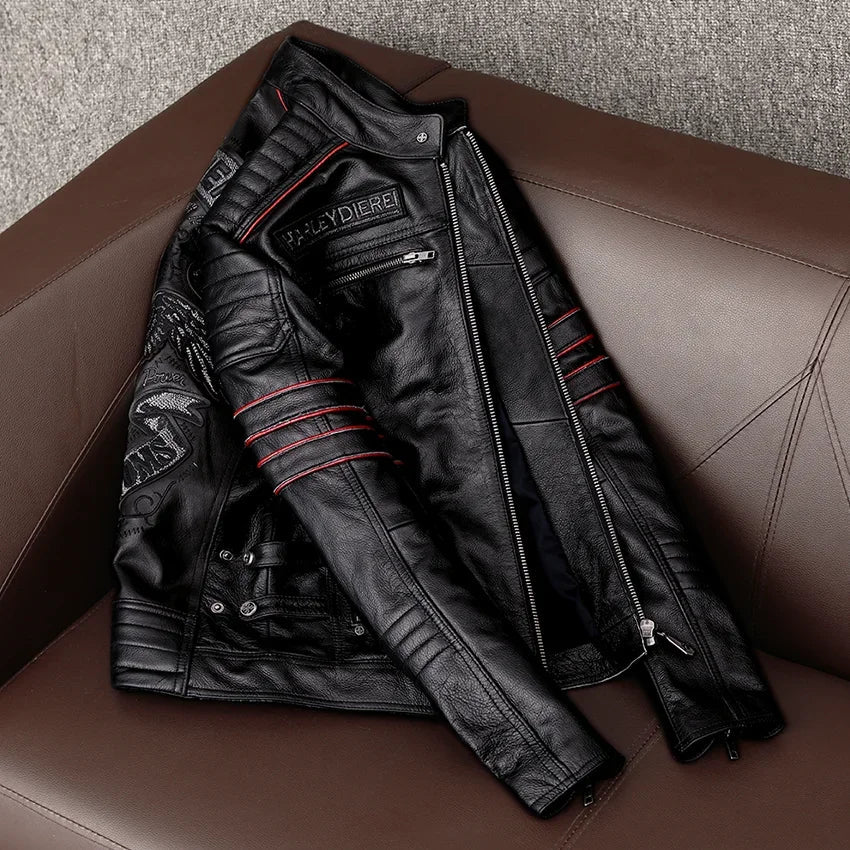 Válassz merész stílust ezzel a valódi bőrből készült, hímzéssel és koponya motívummal díszített férfikabáttal. Utazáshoz, városi kirándulásokhoz és motorkerékpár-rajongóknak tervezve, a tartósságot, a kényelmet és az egyedi karaktert ötvözi. Tökéletes az átmeneti évszakra.