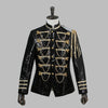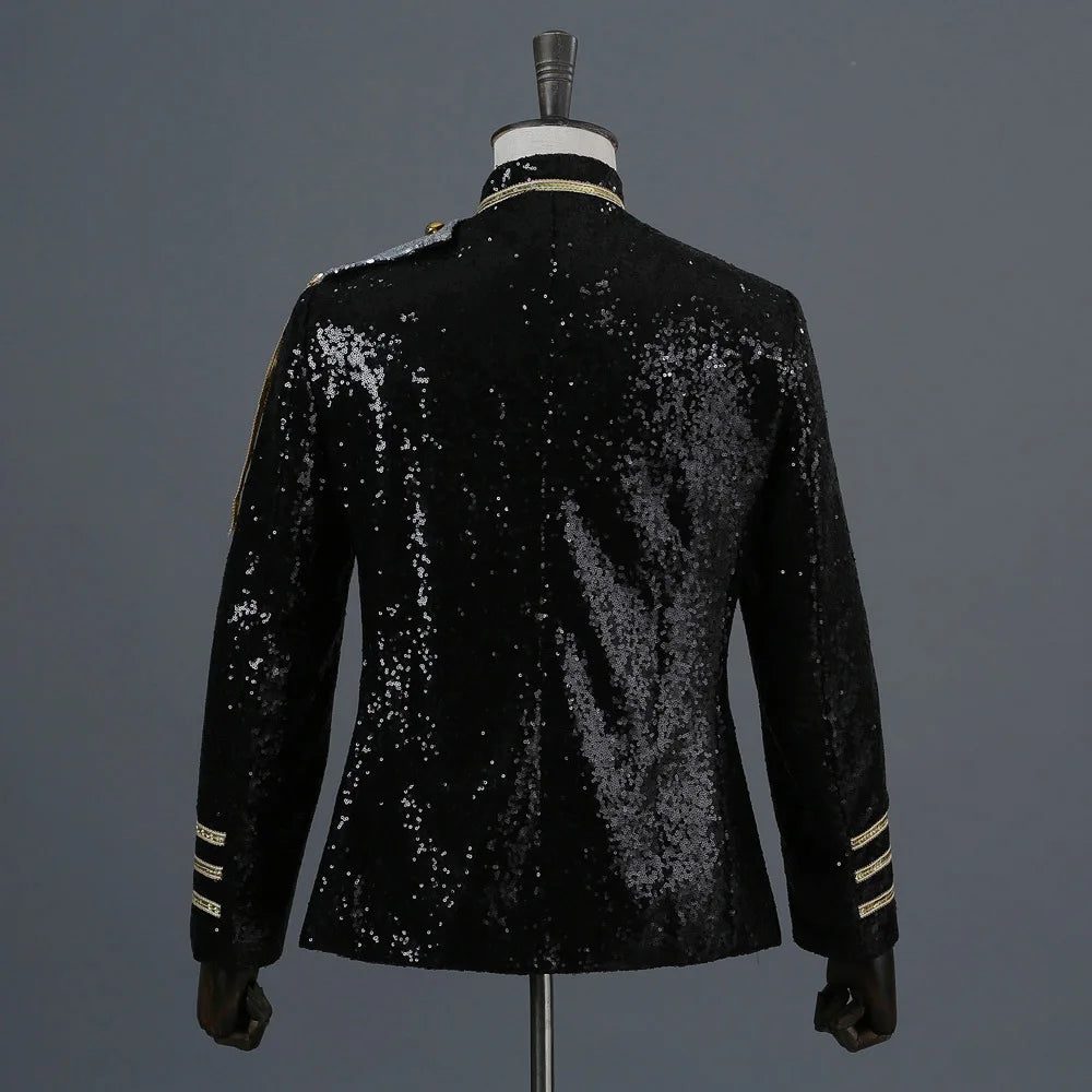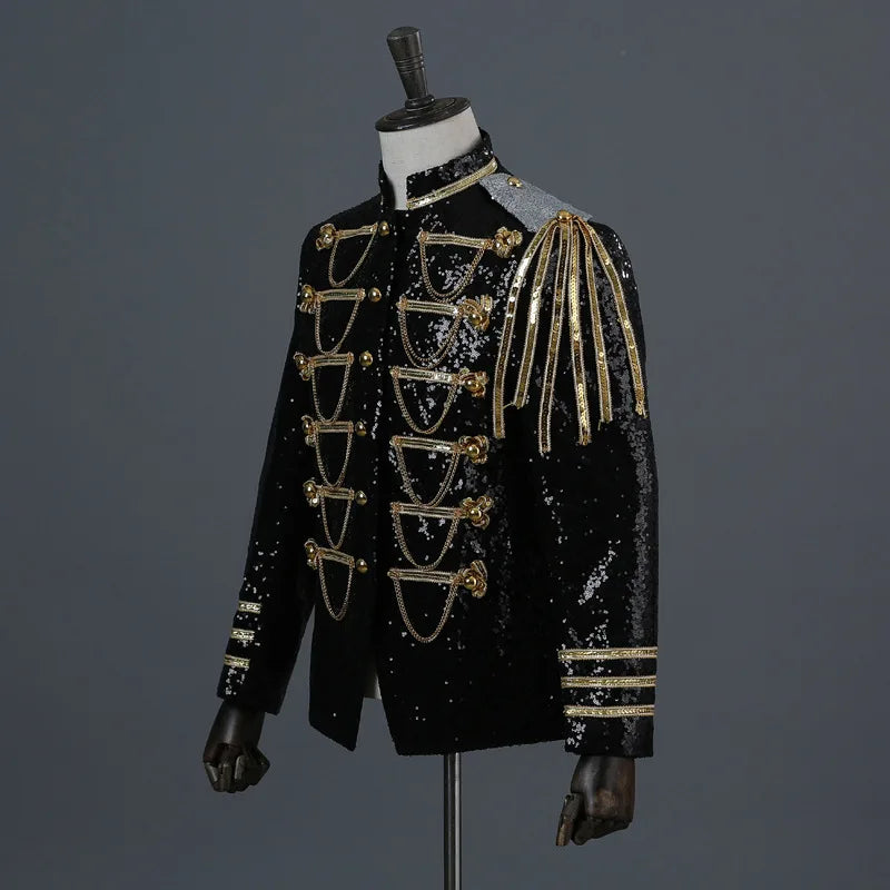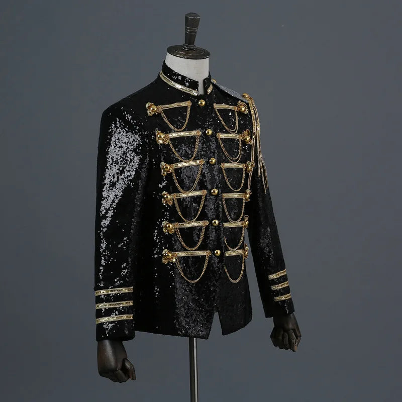 Fekete flitteres fém stílusú kabát láncokkal és arany részletekkel