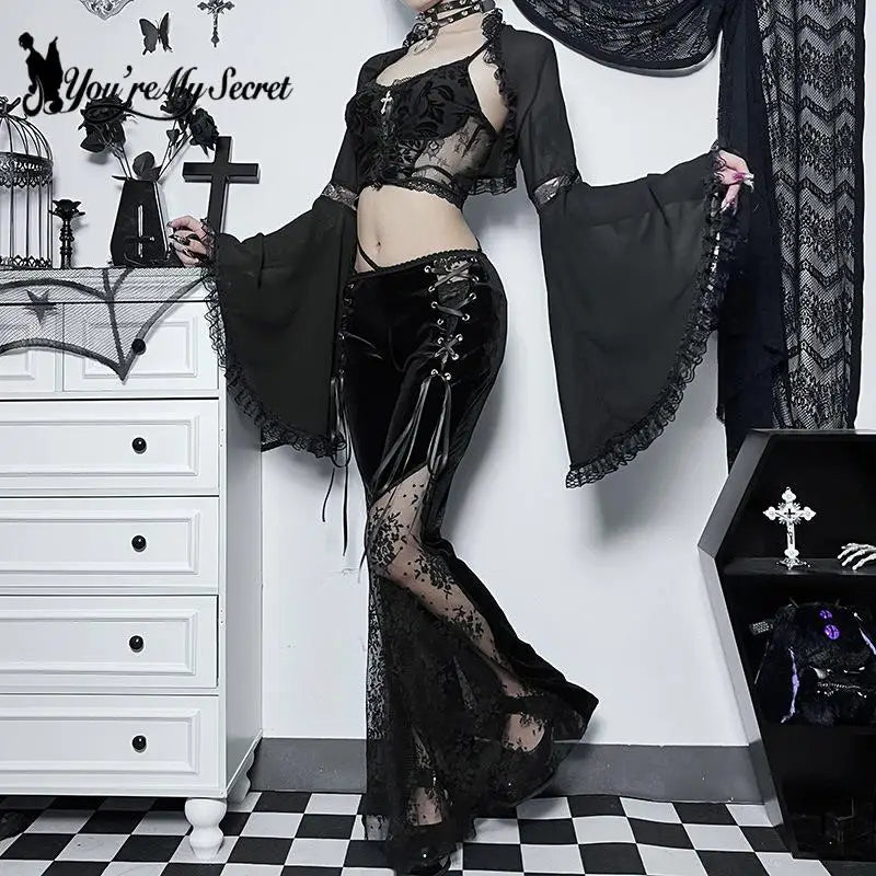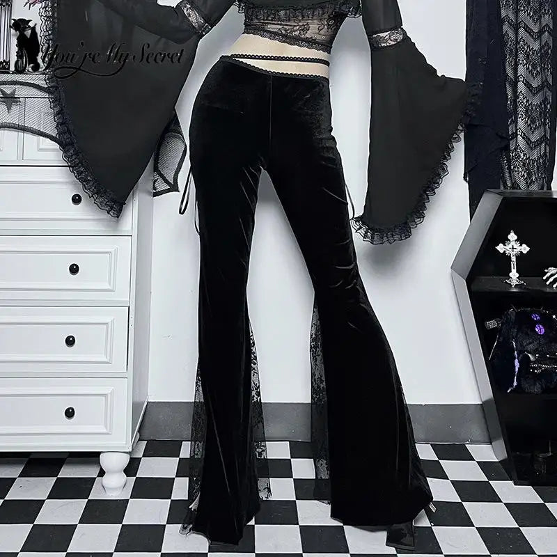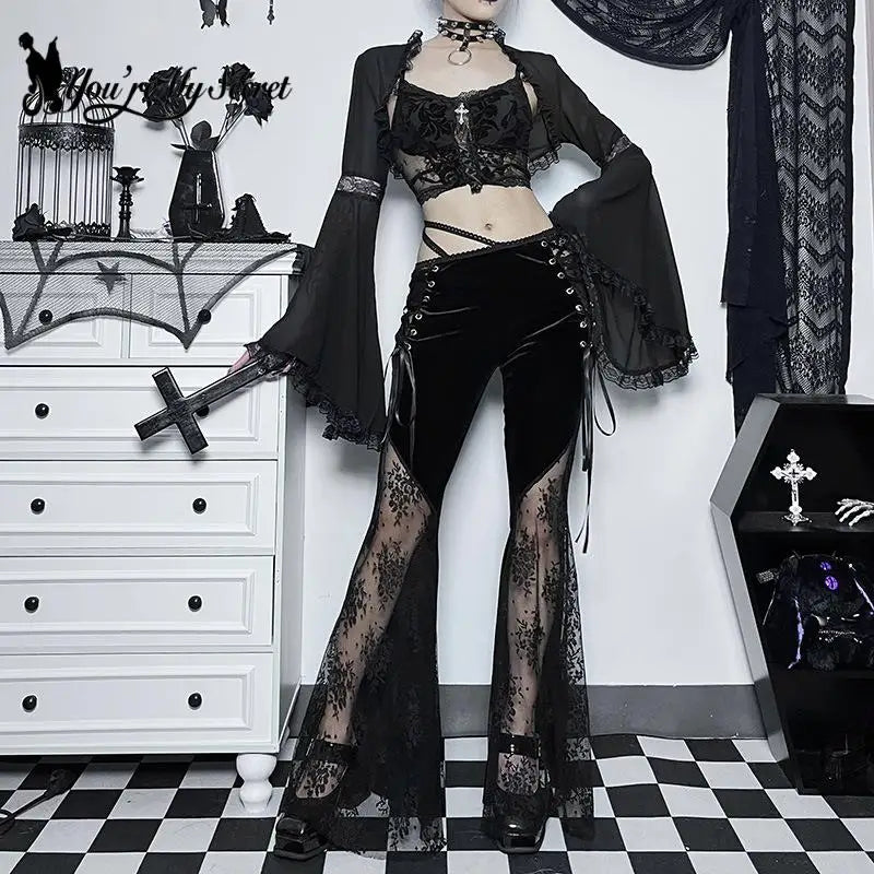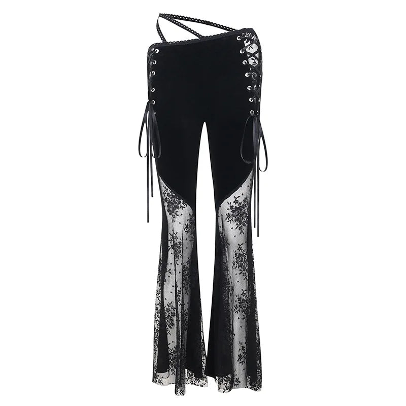 Fekete gótikus nadrág hasítékokkal és csipkerészletekkel