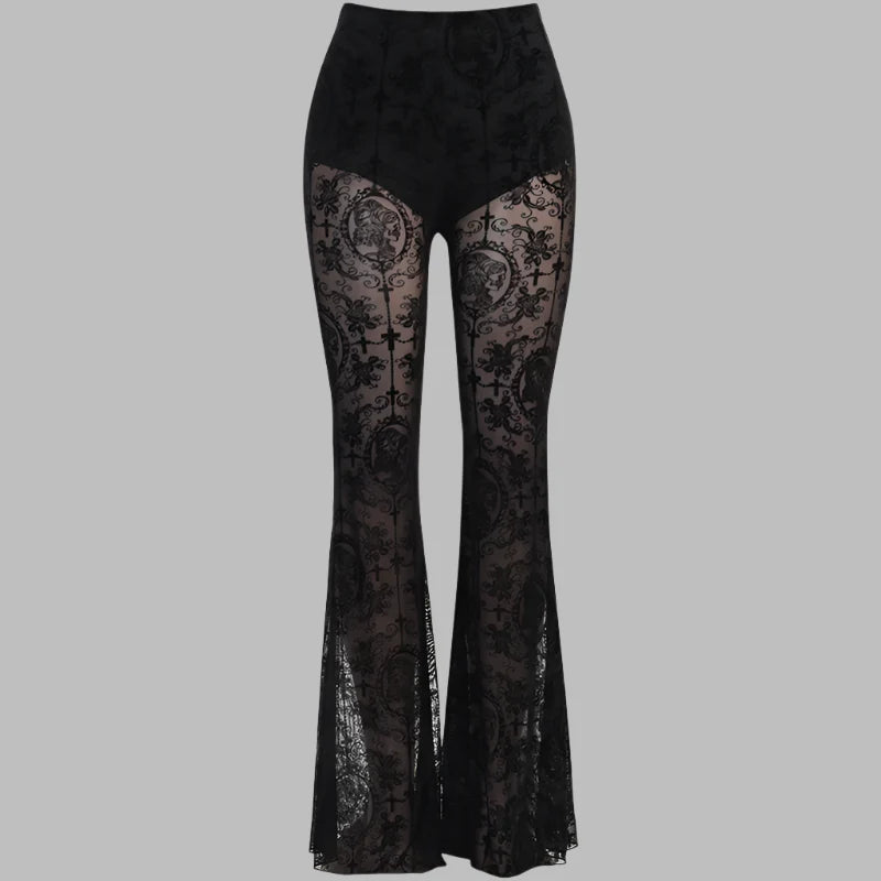 Fekete gótikus nadrág hasítékokkal és csipkerészletekkel Megtekintési beállítások
