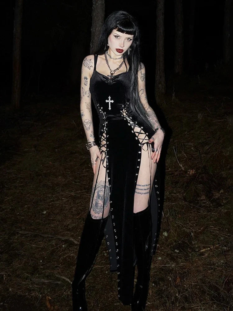Czarna sukienka z rozcięciem w stylu grunge punk z krzyżem i siateczką
