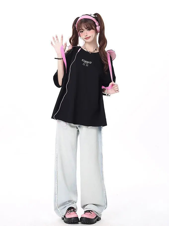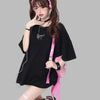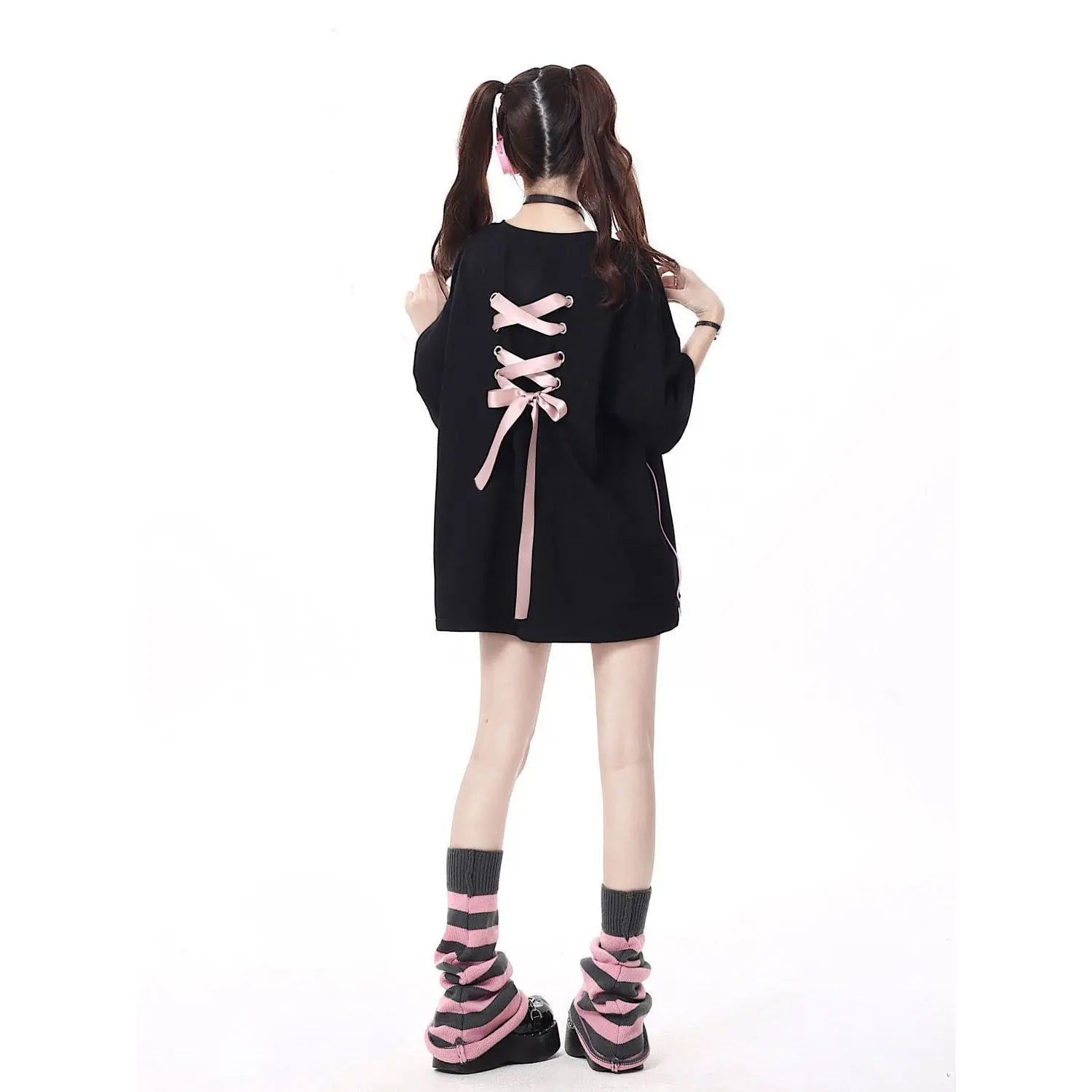Fekete Jirai Kei pulóver hátul fűzéssel és rózsaszín szalaggal