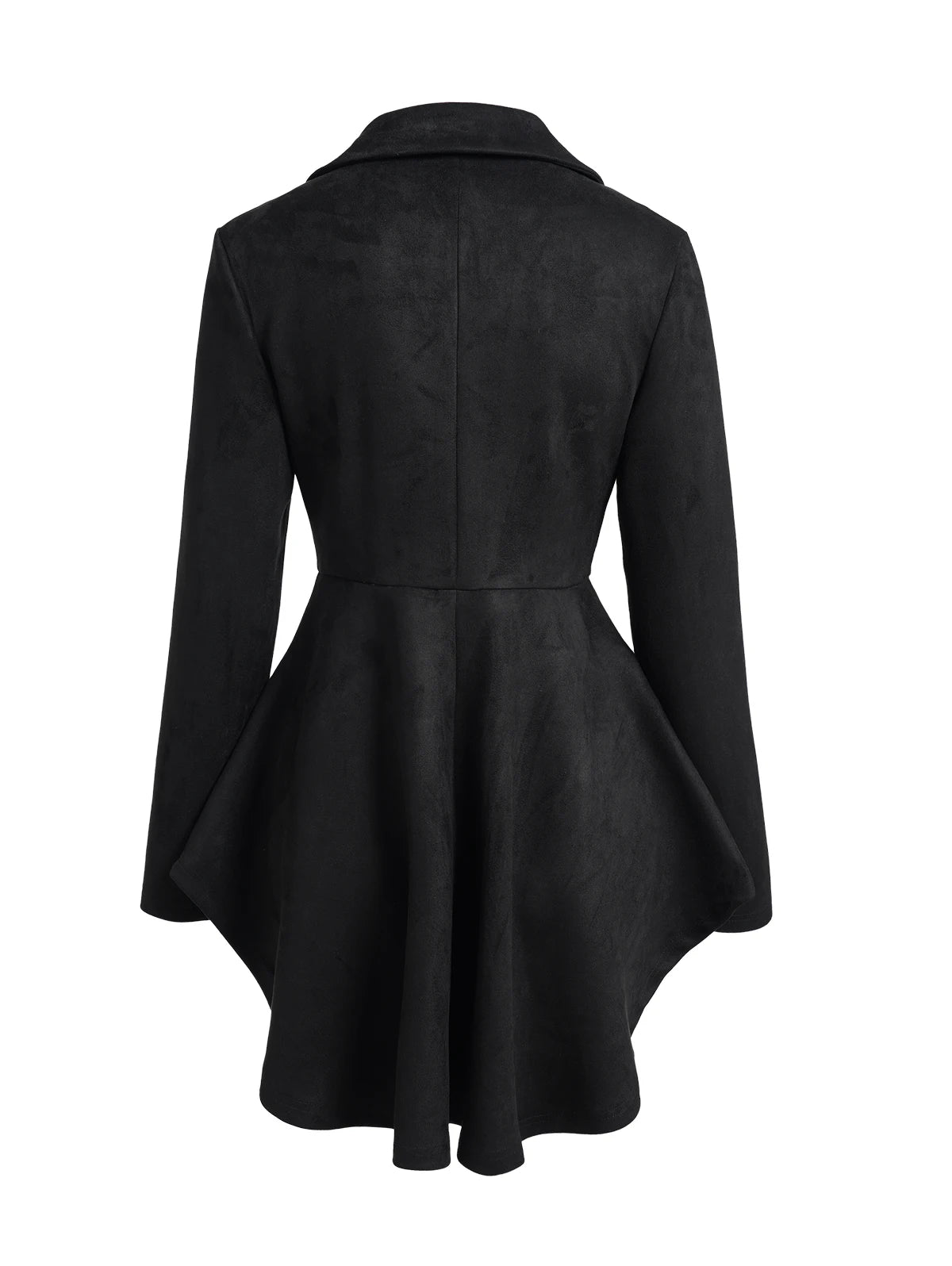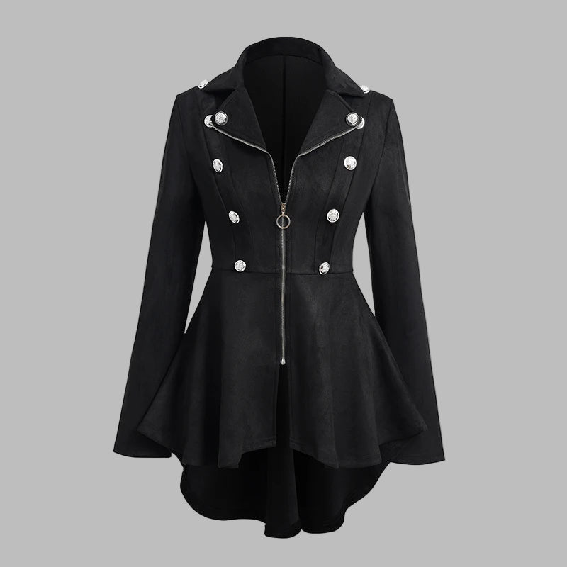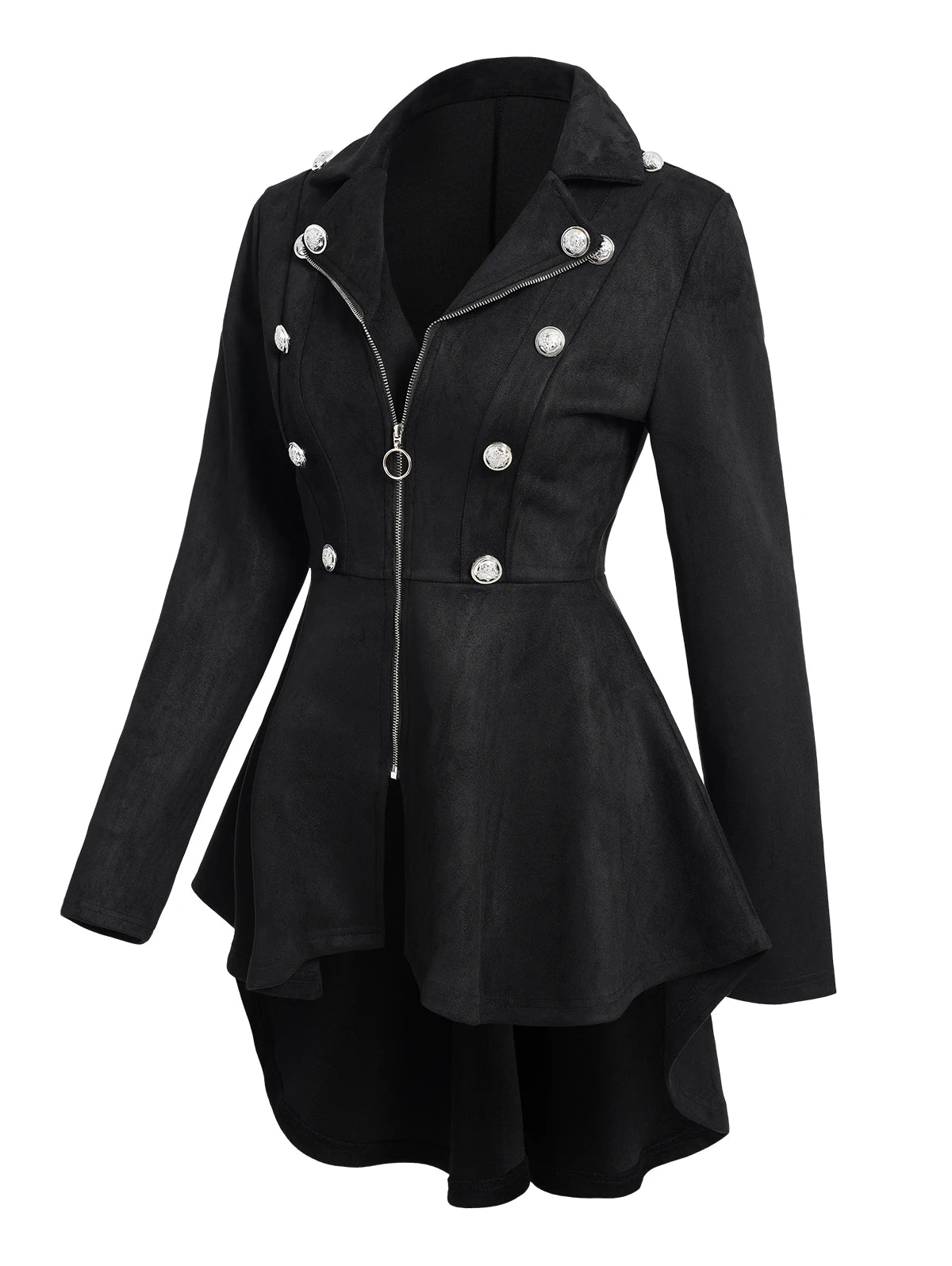 Fekete női gótikus bővülő kabát, gombokkal és cipzárral