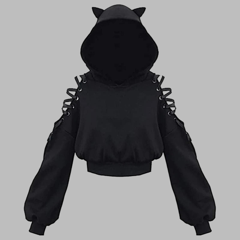 Fekete punk kapucnis pulóver szarvakkal és fűzéssel a vállakon