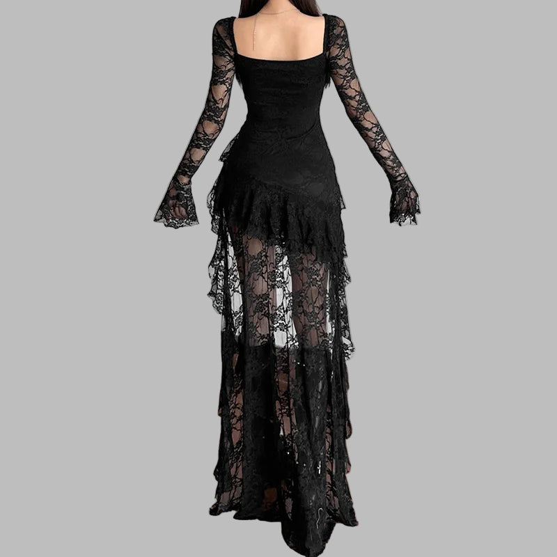 Fekete Rock Ruha Csipkével és Aszimmetrikus Aljjal