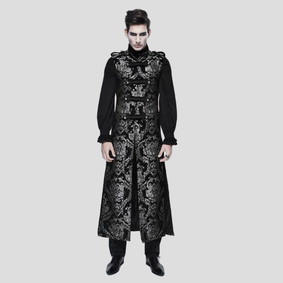 Fekete Steampunk Goth Kabát Brokát Mintával és Pántokkal