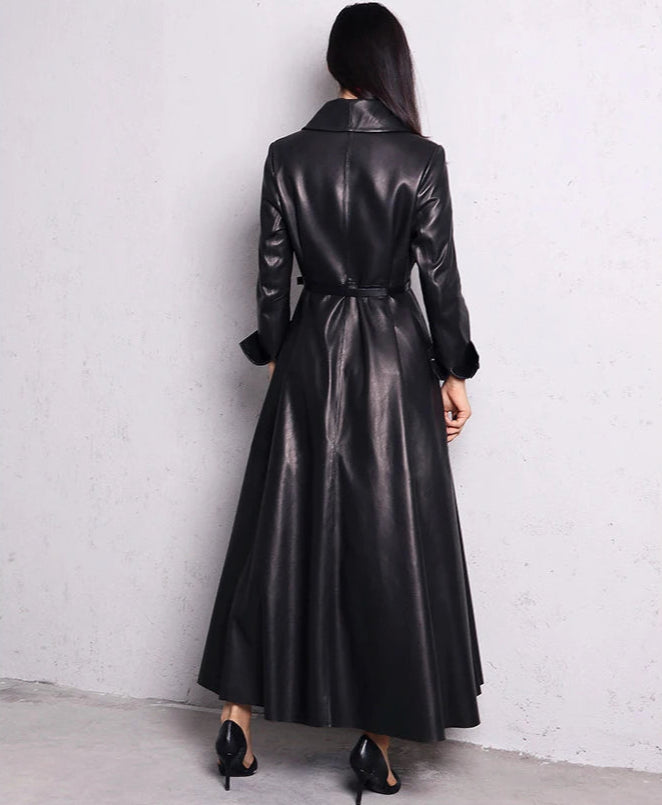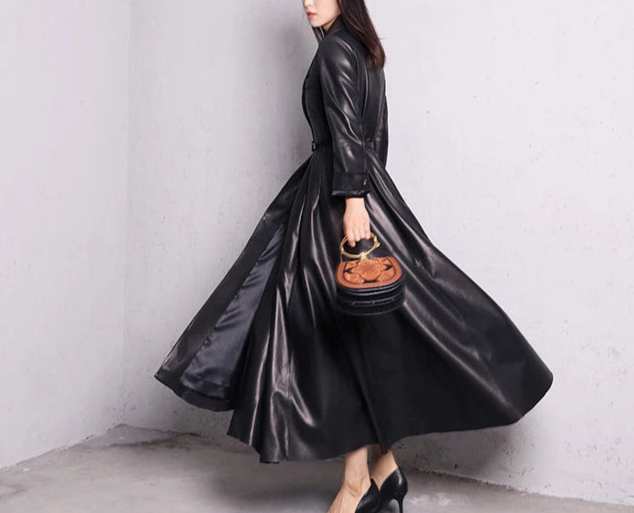 Hosszú fekete elegáns bőr kabát metal goth rock stílusban