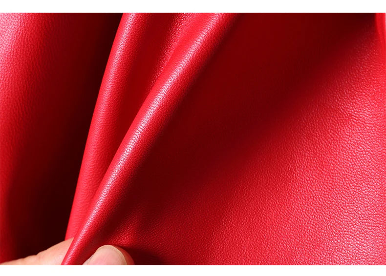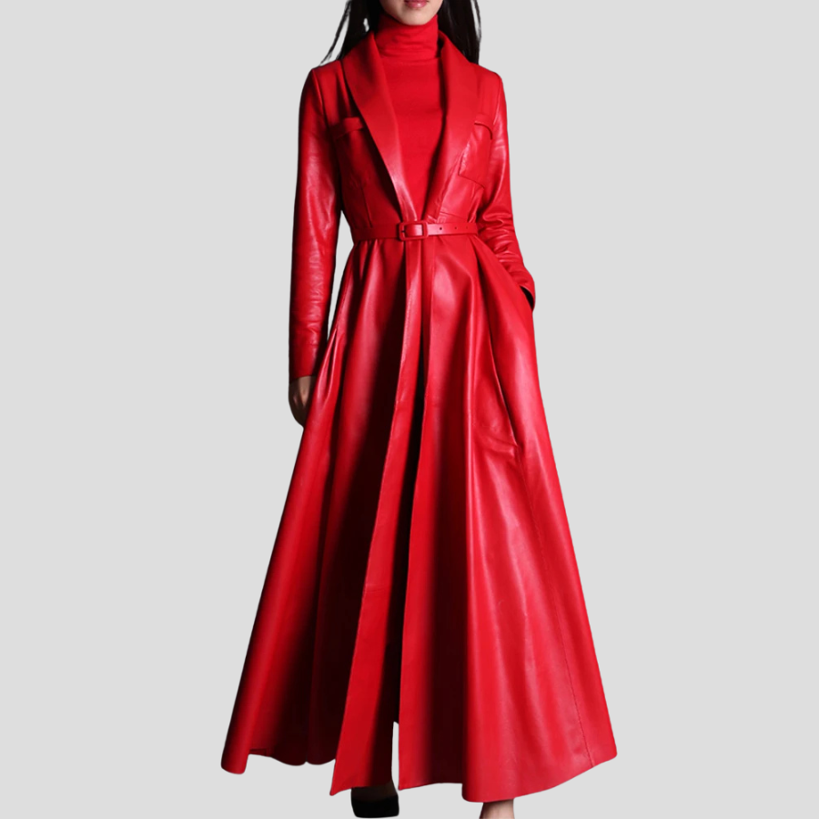 Piros bőr hosszú kabát övvel, rock stílusban