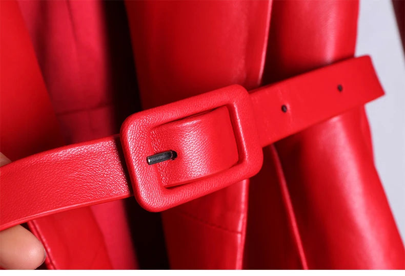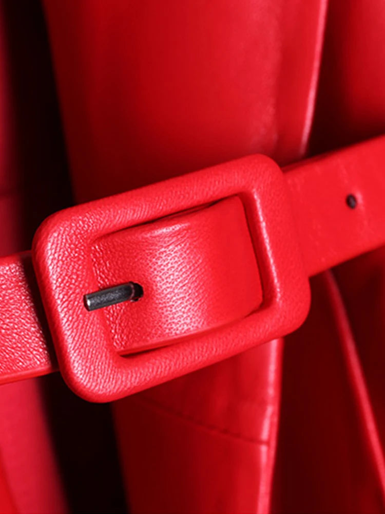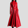 Hosszú Piros Bőr Rock Kabát Övvel