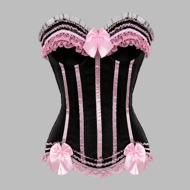 Jirai Kei fekete-rózsaszín fűző masnikkal és csipkével