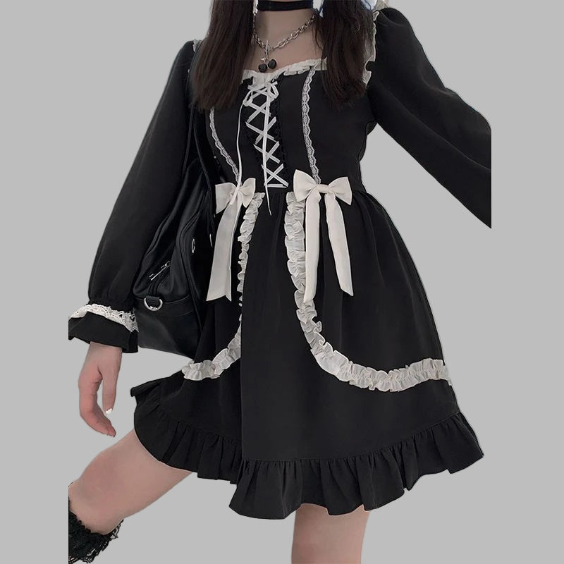 Jirai Kei fekete ruha fehér masnikkal és fűzéssel
