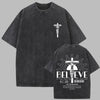 Koszulka Oversize Grunge z Krzyżem i Napisem Believe Gotycka