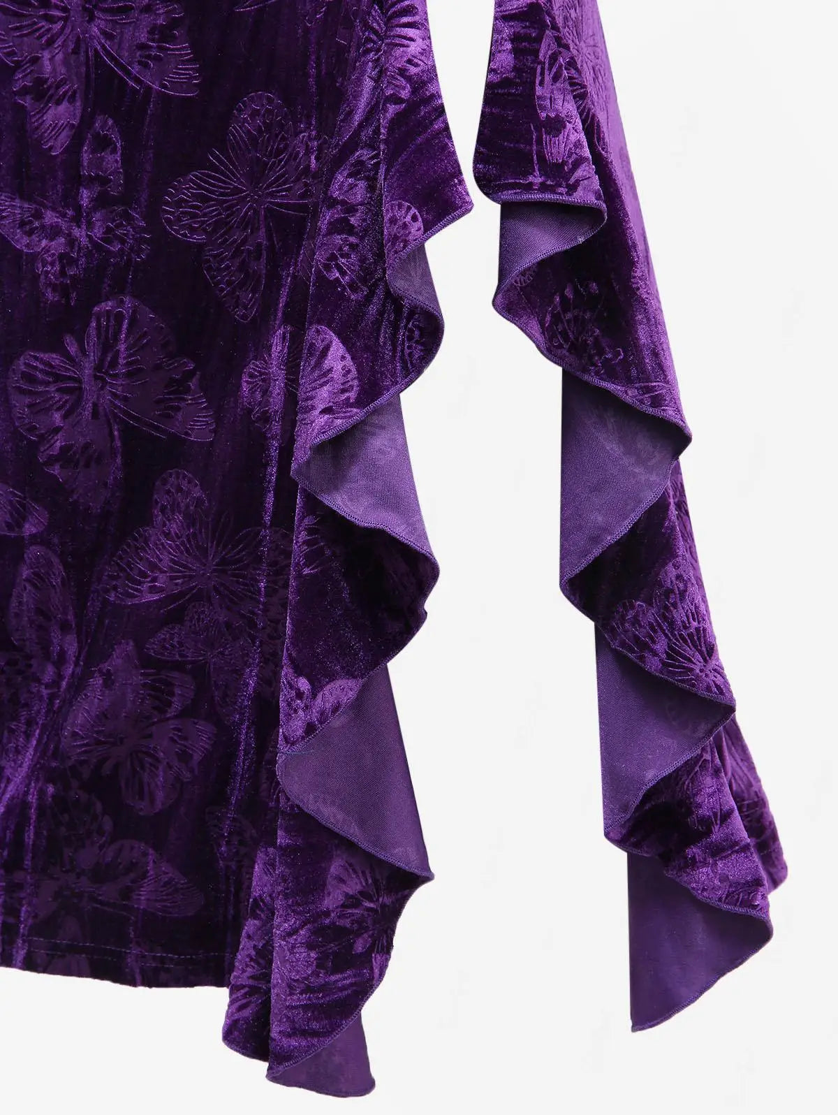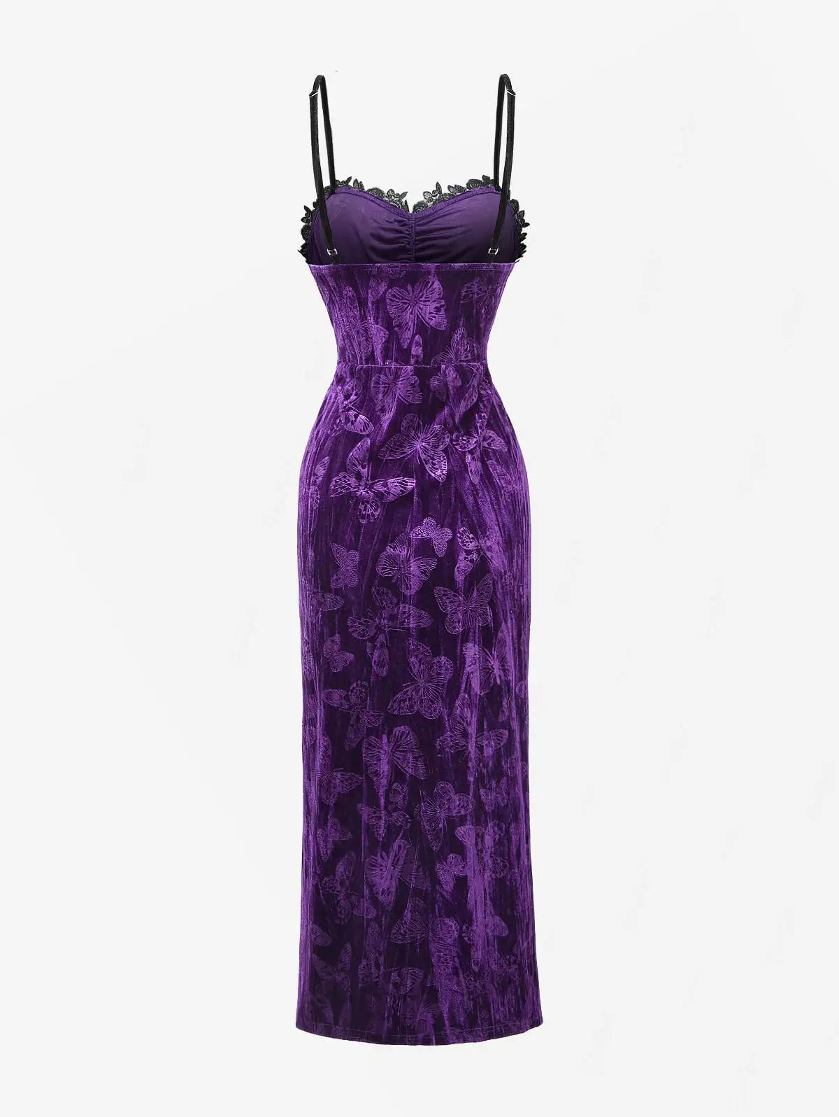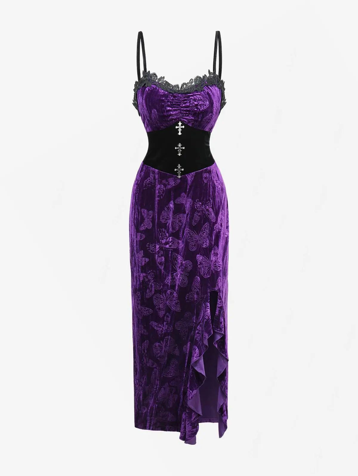 Lila bársony hosszú gótikus ruha csipkével és keresztekkel