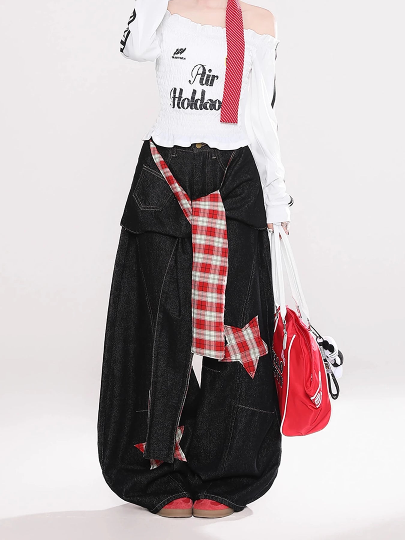Női fekete punk bő szárú hosszú nadrág csillagokkal, oversize