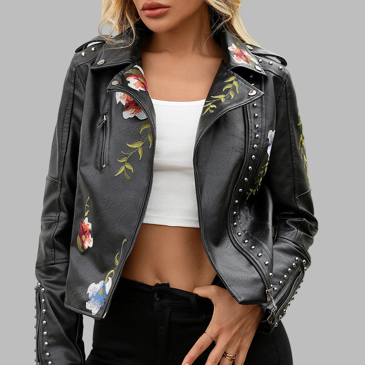 Női fekete bőr gótikus kabát szegecsekkel és virágos hímzéssel