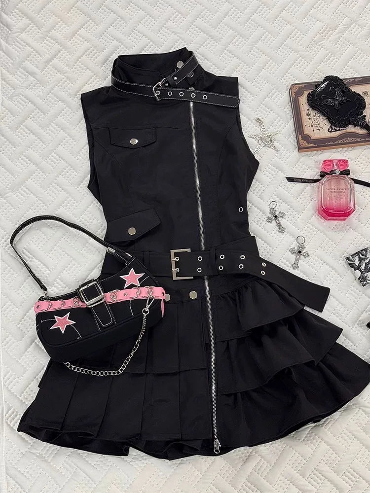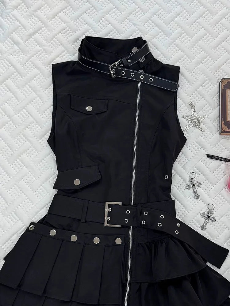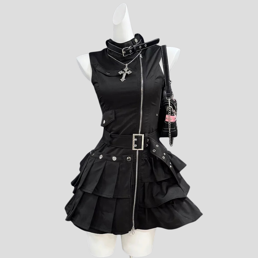 Női fekete gótikus ruha csíkokkal, cipzárral és fodrokkal