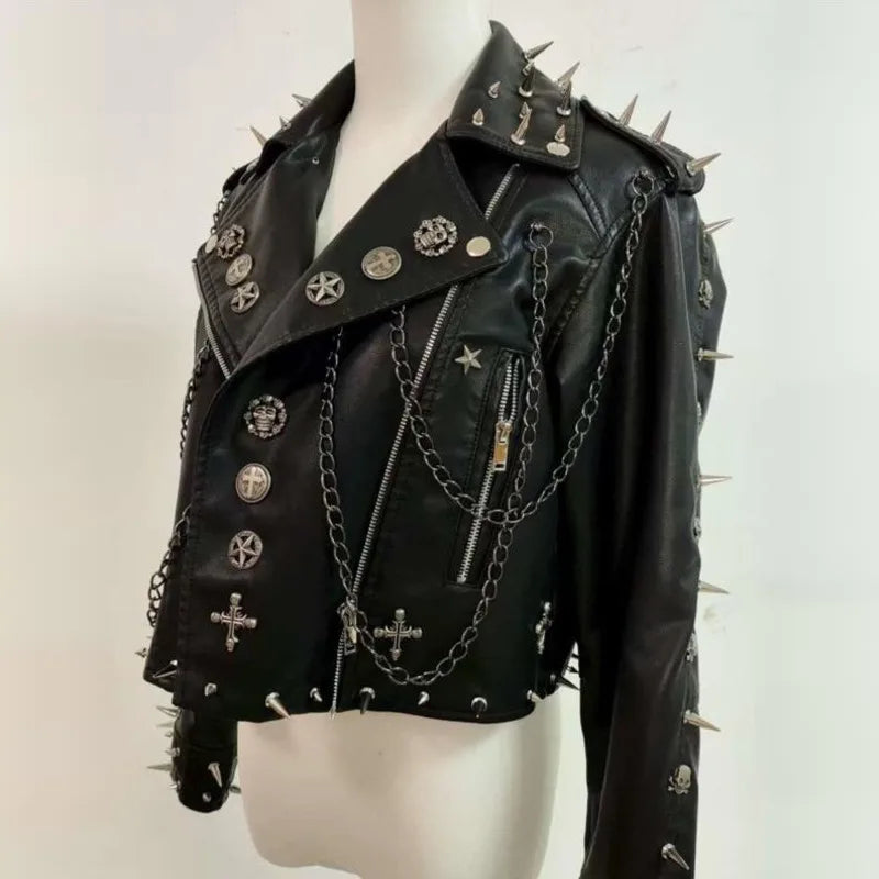 Női rövid fekete punk dzseki szegecsekkel és láncokkal