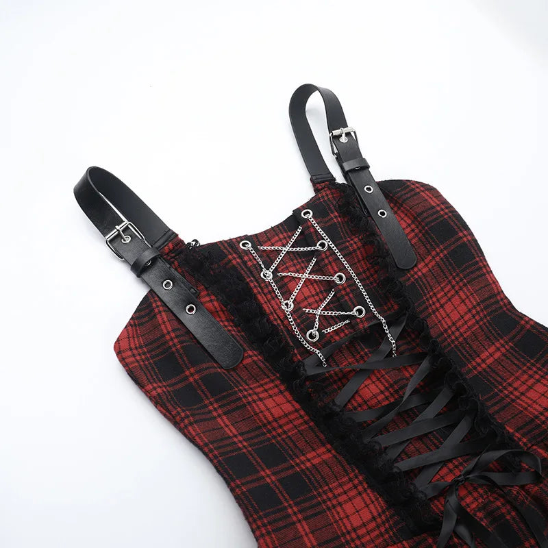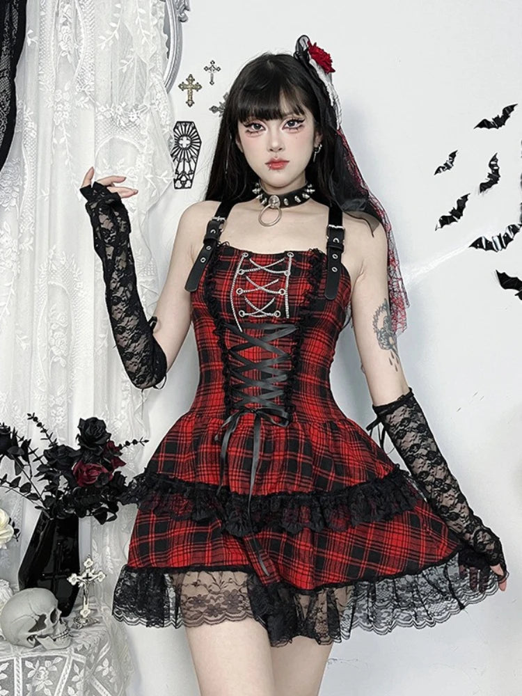 Piros punk rock ruha láncokkal és csipkével Lehetosegek megtekintese