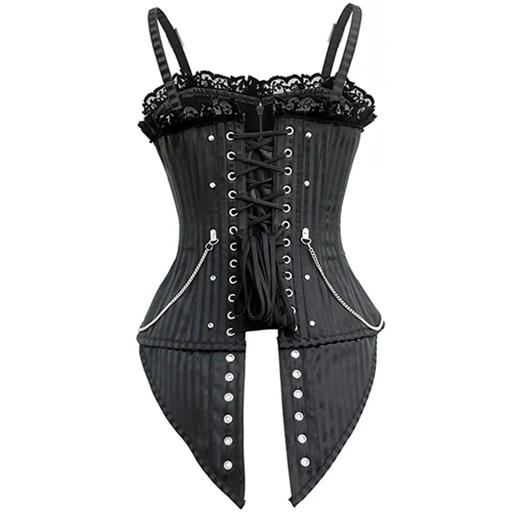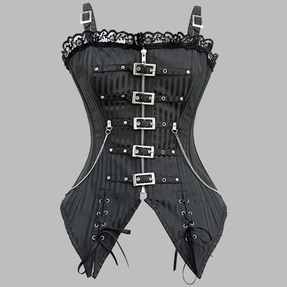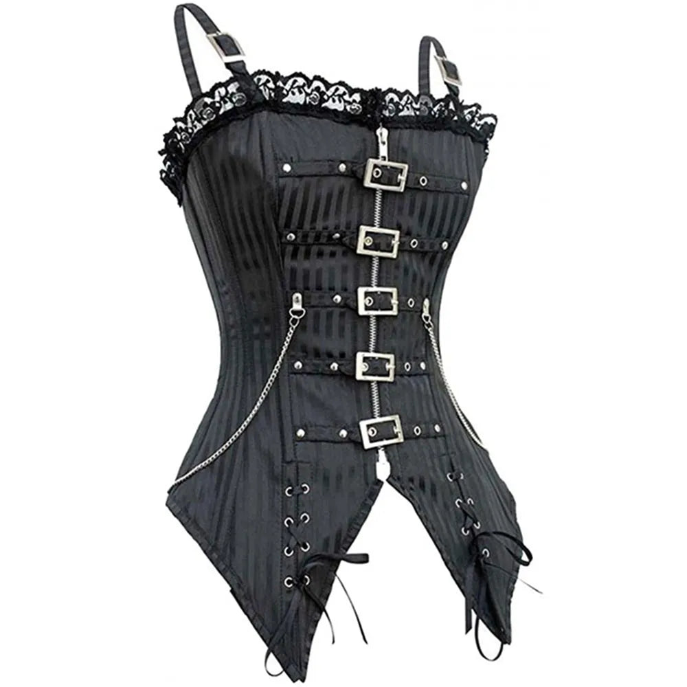 Punk gótikus fűző csatokkal, szegecsekkel és láncokkal, fekete bordázott XXL