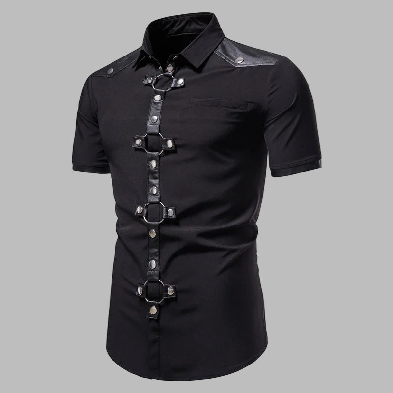 Punk Koszula z Metalowymi Kółkami i Paskami Krótki Rękaw Czarna