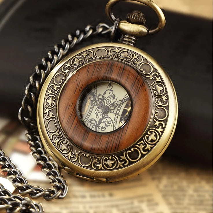 Steampunk Zegarek Kieszonkowy z Drewnianą Wstawką Brązowy