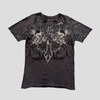 Szürke fém póló koponyákkal és kereszttel, díszes